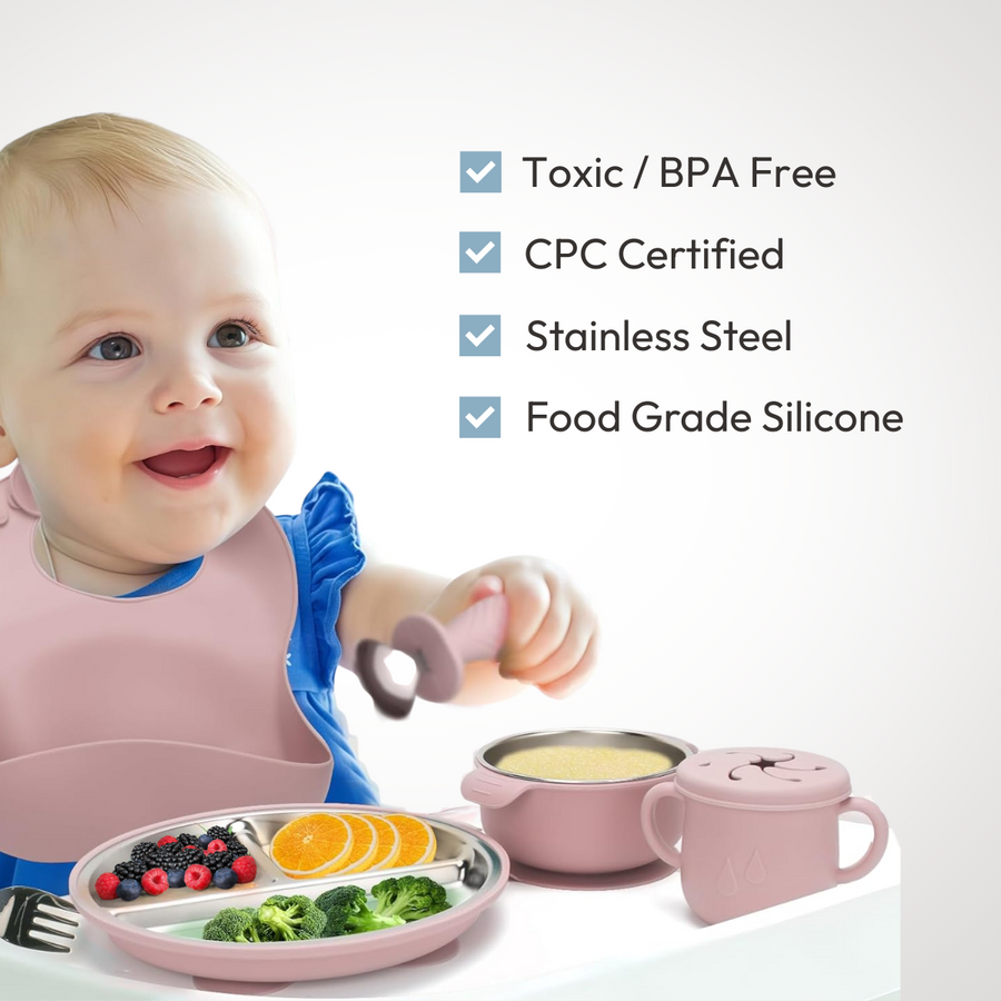 The First Essentials Set is designed for little ones starting solids (around 4–6 months) and grows with them into toddler years.